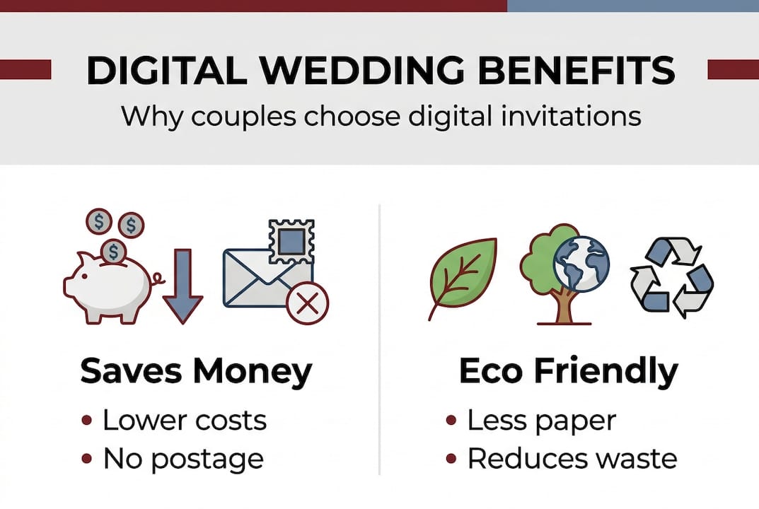 Cost is another major factor. Cost-saving digital invitations can reduce invitation budgets by hundreds of dollars when you factor in design, printing, postage, and follow-up mailing costs. That money can go toward the honeymoon, florals, or an upgraded venue.
