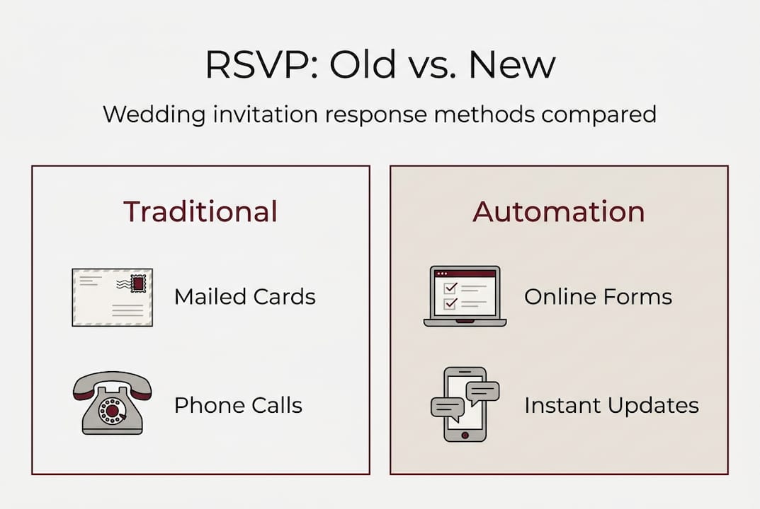 Traditional RSVP management relies on three primary approaches: mailed response cards, phone calls, and manual spreadsheet tracking. Each method carries inherent limitations that automation addresses directly.