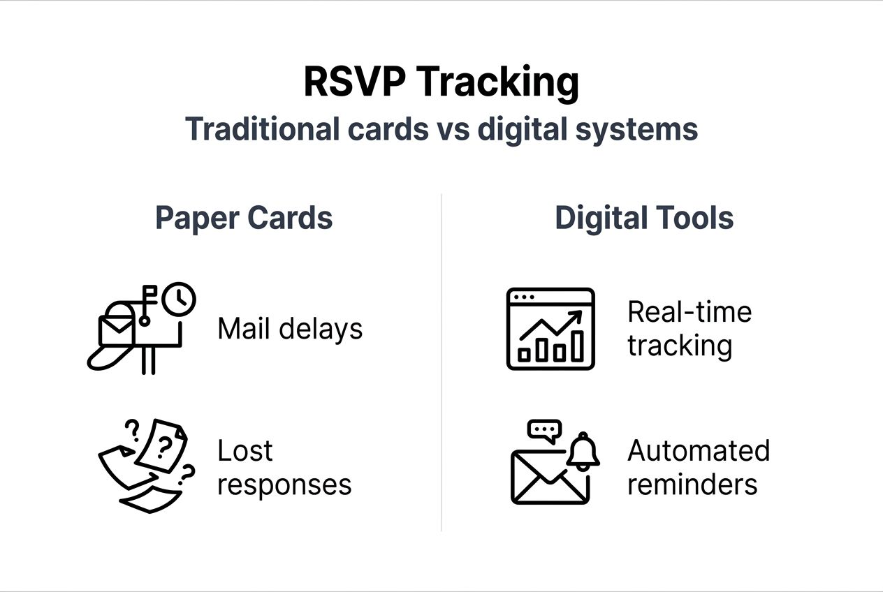 Tracking wedding RSVPs manually creates unnecessary stress for couples already juggling countless planning tasks. Paper cards get lost, responses arrive incomplete, and chasing down non-responders eats precious time. This guide shows you how digital wedding invitations with RSVP tracking transform chaotic guest management into a streamlined, error-free process that saves time and reduces wedding planning anxiety.